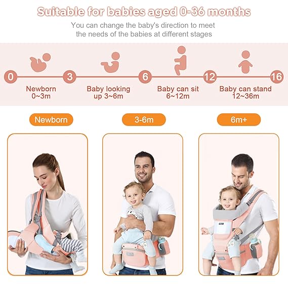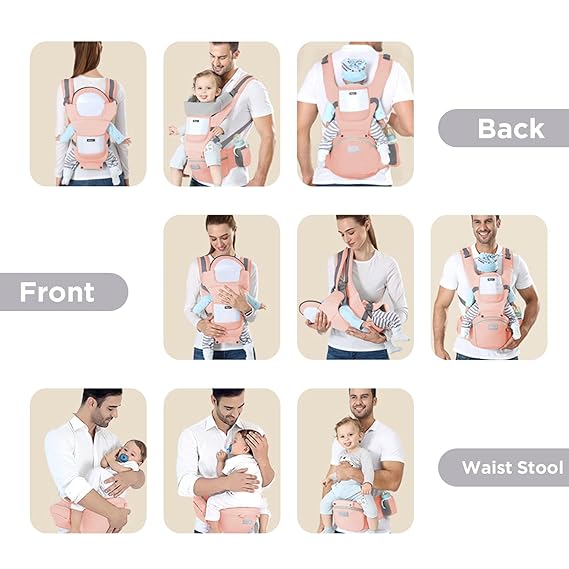 [Versatile Baby Carrier: This baby carrier offers 3 combinations and 6 wearing styles perfectly accommodating baby and toddler from 0-36 months. Whether you are hiking or traveling carry the baby on your front or back to free hands and focus on other things Ergonomic Design: The baby toddler carrier with hip seat utilizes an ergonomic "M" shape design with a waist belt for your baby. This allows baby\s legs to bend naturally promoting a comfortable and natural posture while also supporting healthy hip spine and leg joint development Large Storage Pockets: This baby carrier has ample storage space on both sides of the waist and under the seat which can easily accommodate essentials such as bottles mobile phones keys and diapers making it your carry-on diaper bag Adjustable & Velcro Waist Belt: Extra long waistband can be adjusted from 29 inches to 50 inches with Velcro and buckle providing parents with personalized fit. With a maximum weight capacity of 33 pounds this newborn carrier can evenly distribute weight minimize back strain and protect your spine Breathable Mesh Fabric: This baby hip carrier is made of breathable 100% mesh polyester Brazilian fabric to ensure comfort and breathability. After rigorous testing all materials are safe and reliable giving you peace of mind]