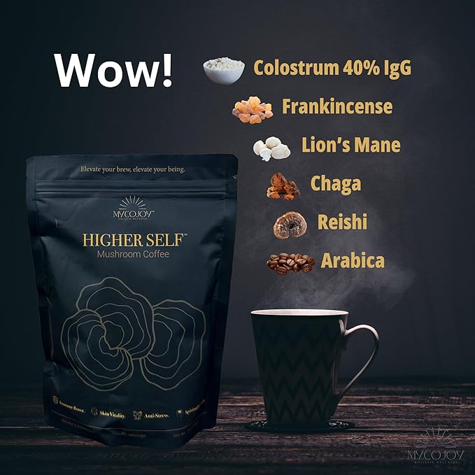 [Focus & Clarity: Lion’s Mane Reishi and Chaga mushrooms for enhanced cognitive function. Immune Boost: 40% IgG Colostrum strengthens immunity and supports gut health. Balanced Energy: L-Theanine provides a calm focused energy without jitters. Mindful Ingredients: Organic Arabica coffee with a dash of calming Frankincense. Nourishing & Delicious: A rich smooth coffee blend with added wellness benefits.]